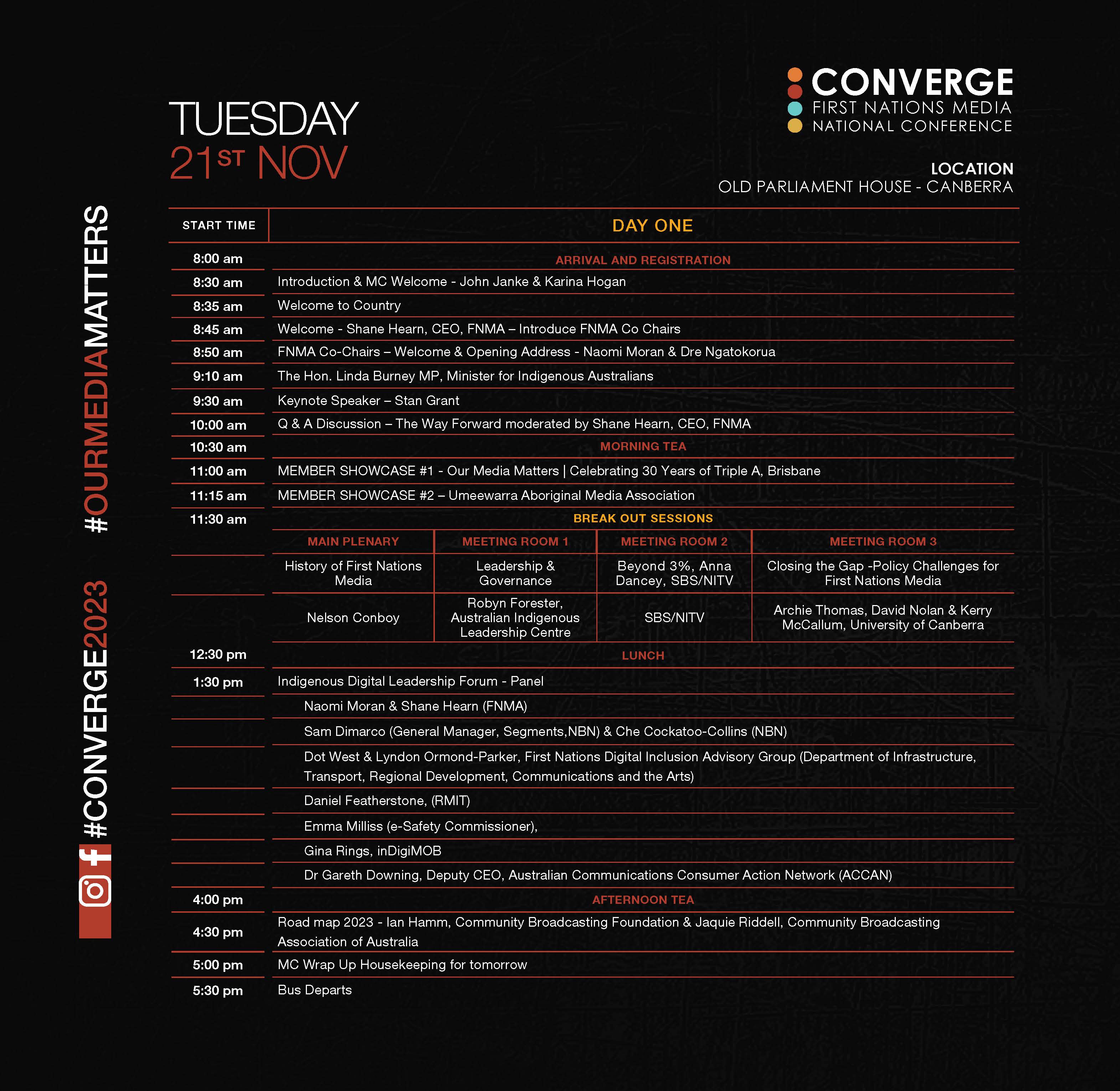 CONVERGE 2023 will be bringing the First Nations media industry together to learn, share and network on Ngunnawal/Ngambri country from 21-23 November 2023 under the guiding theme of OUR MEDIA, OUR VOICE.